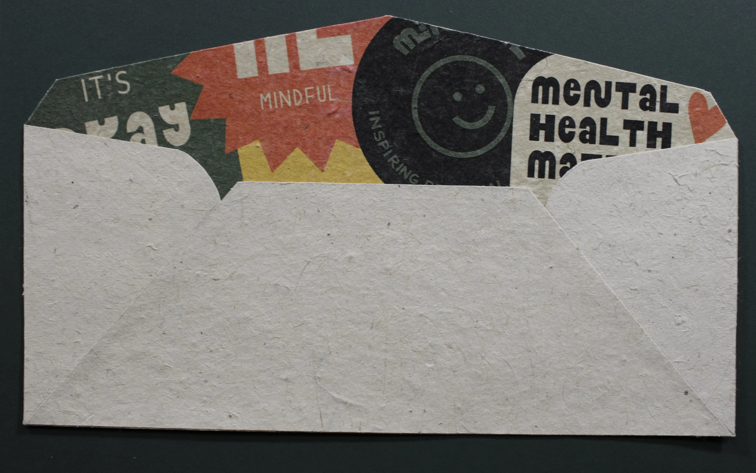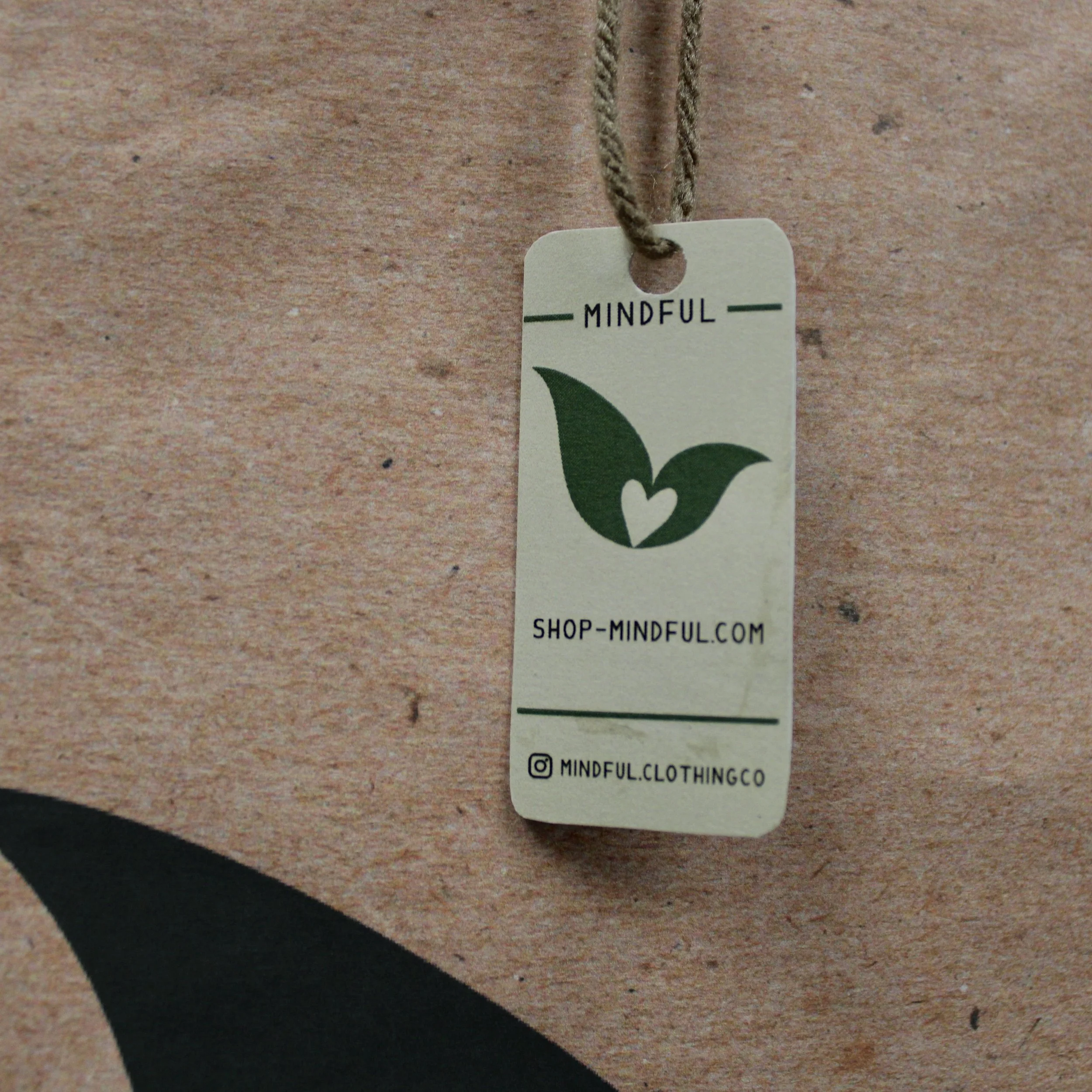 This paper bag mockup would be used by customers from a physical store location of Mindful and would be made out of recycled paper. The QR code on the tag provides a link to mental health resources.