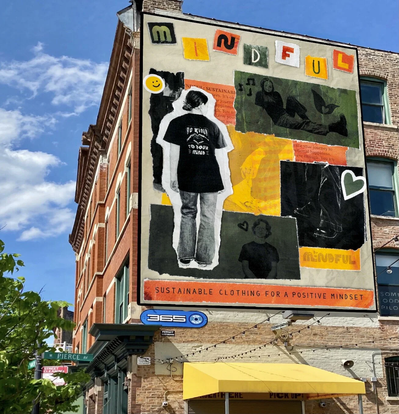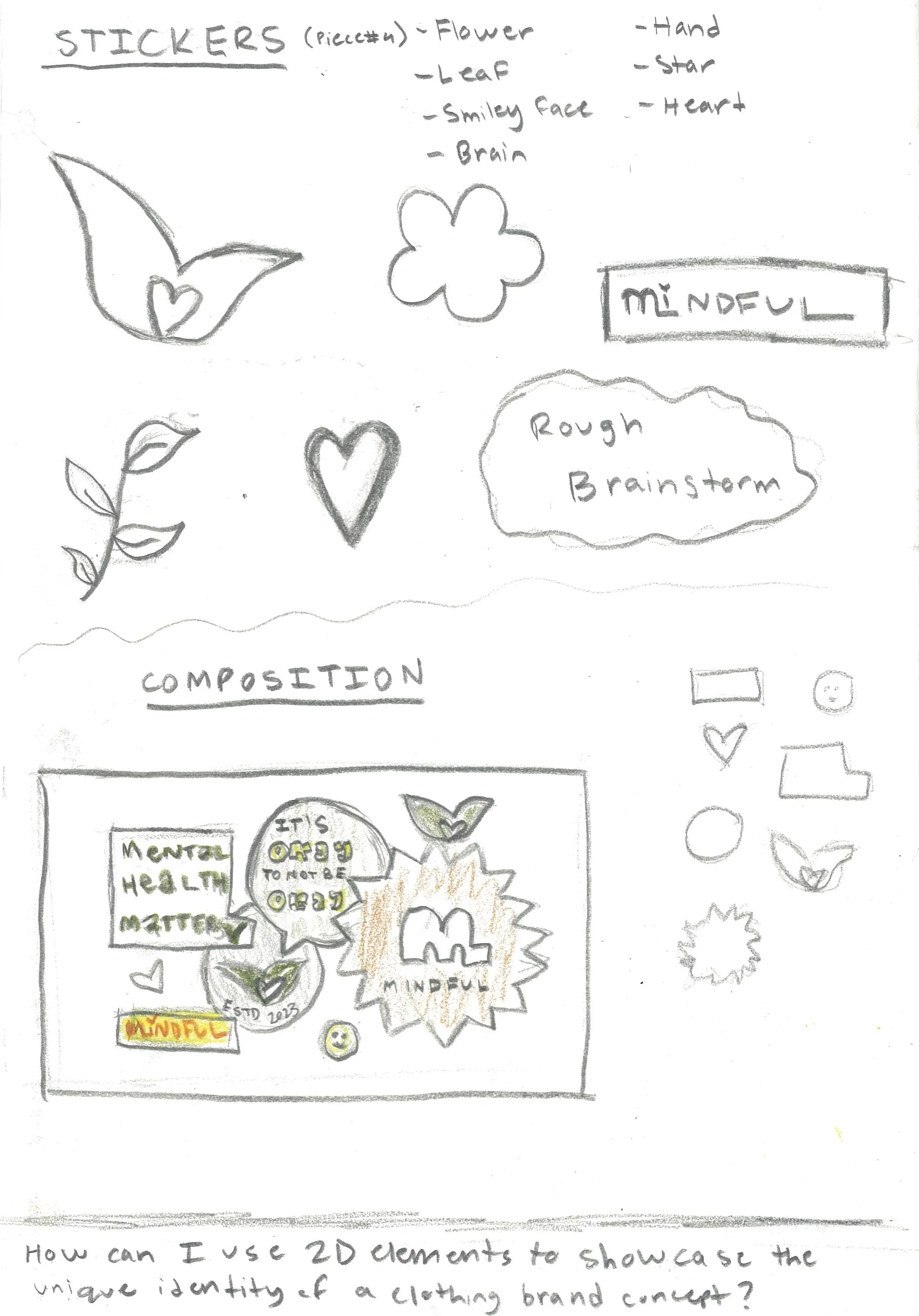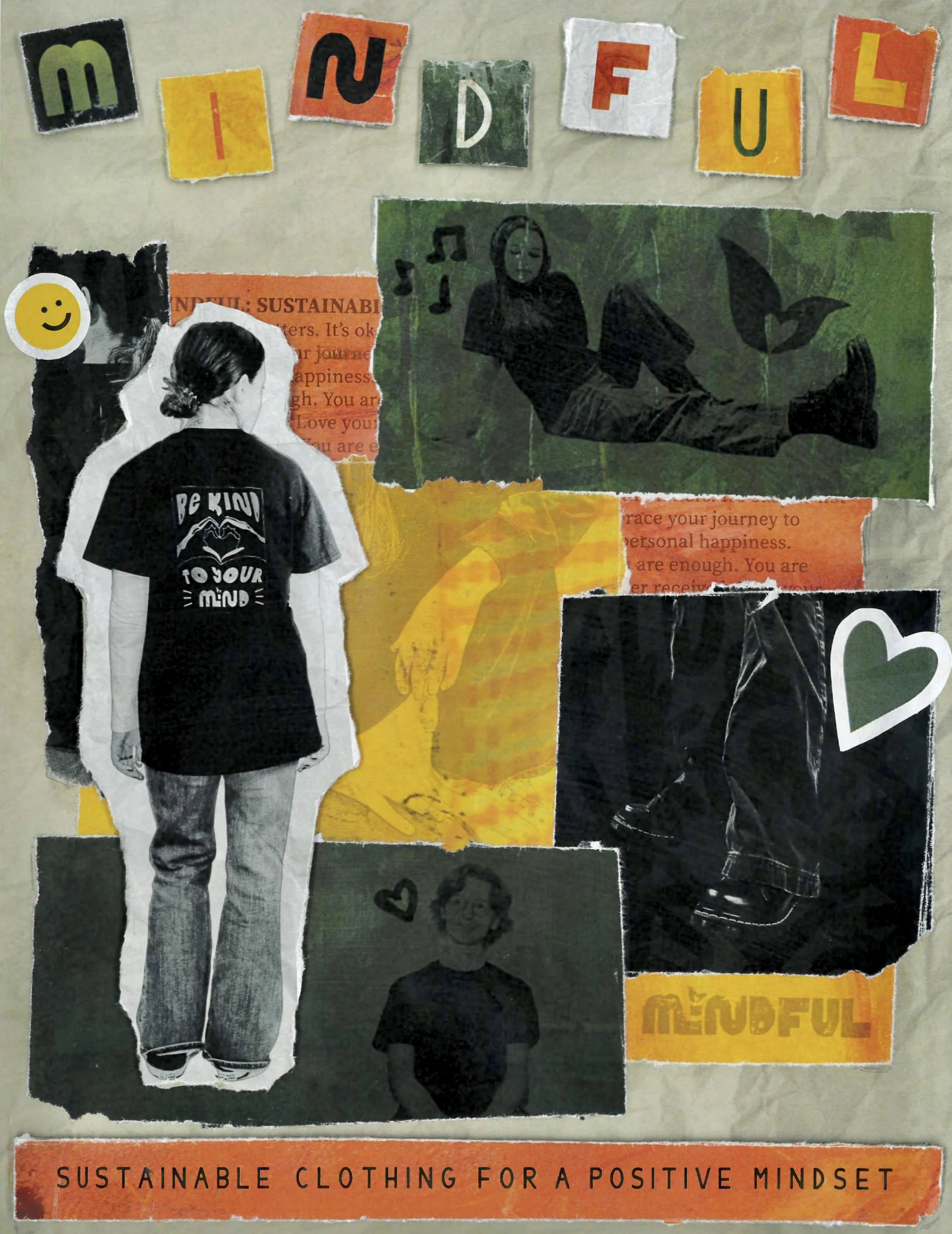 In Advanced Placement (AP) 2D Art and Design, I focused on designing an entire brand identity for Mindful, a sustainable clothing brand that emphasizes being mindful of both your mental health and your impact on the planet by using positive messages and sustainable practices and materials. My goal was to explore all the aspects of creating a clothing brand through mixed media artworks that expand beyond the digital realm.
