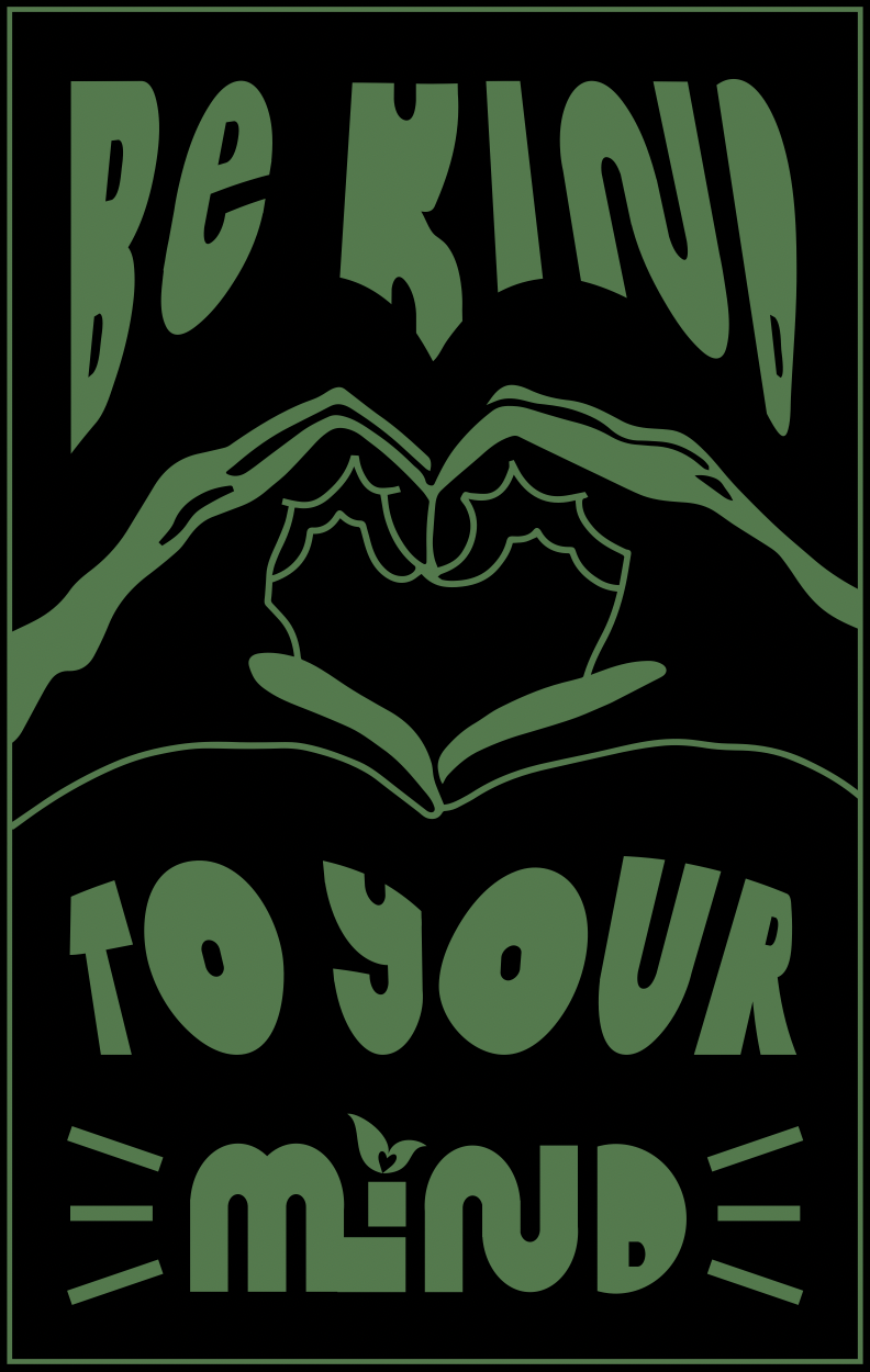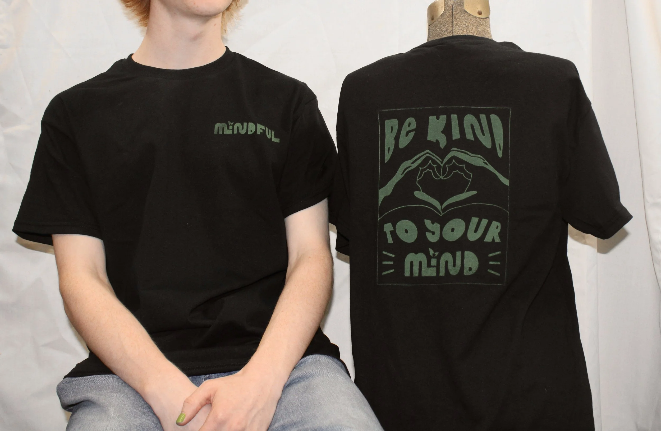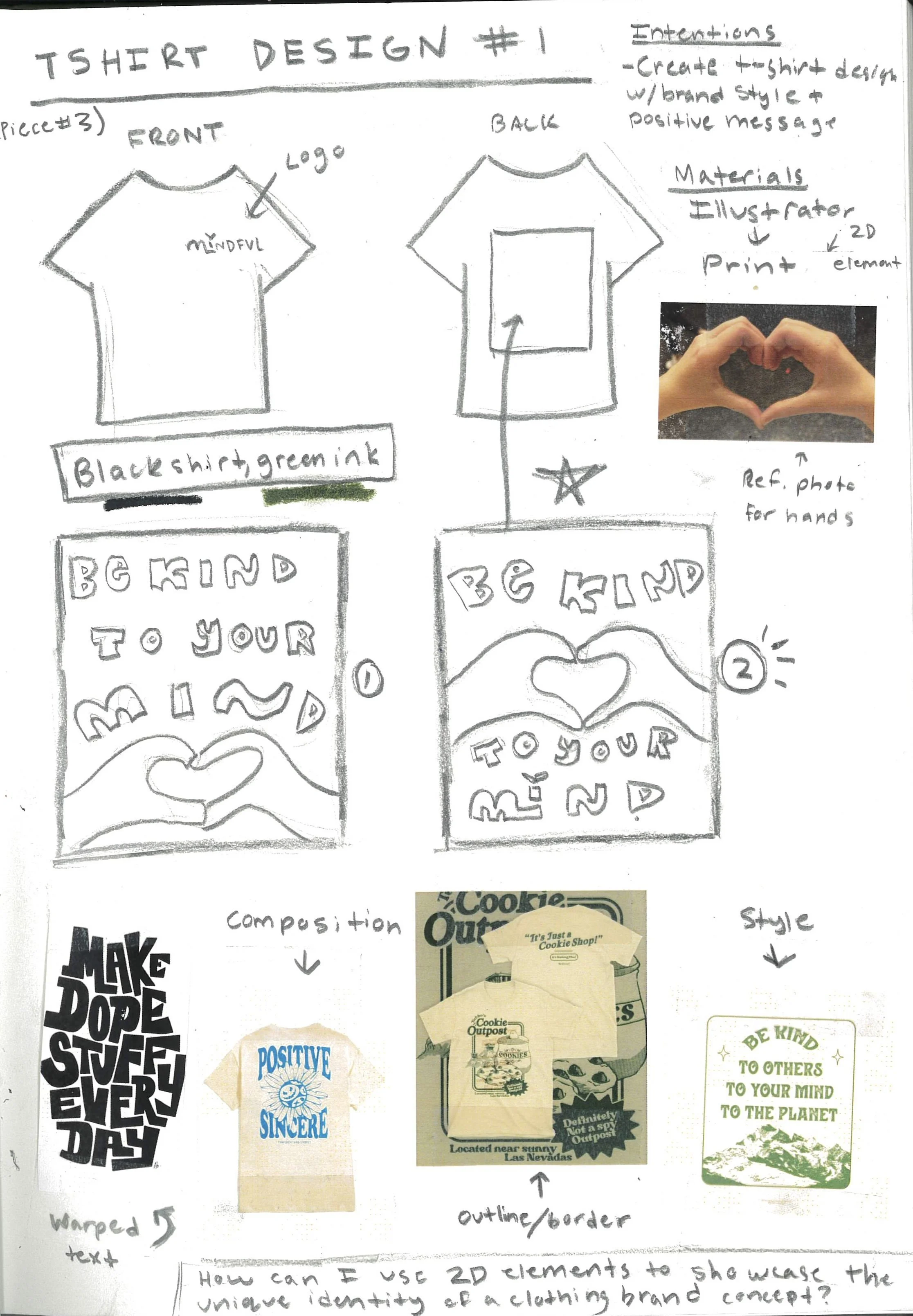 I chose to create a t-shirt design next to expand on my brand identity and show what one of the products might look like, emphasizing the brand value of mental health through the message “BE KIND TO YOUR MIND”.