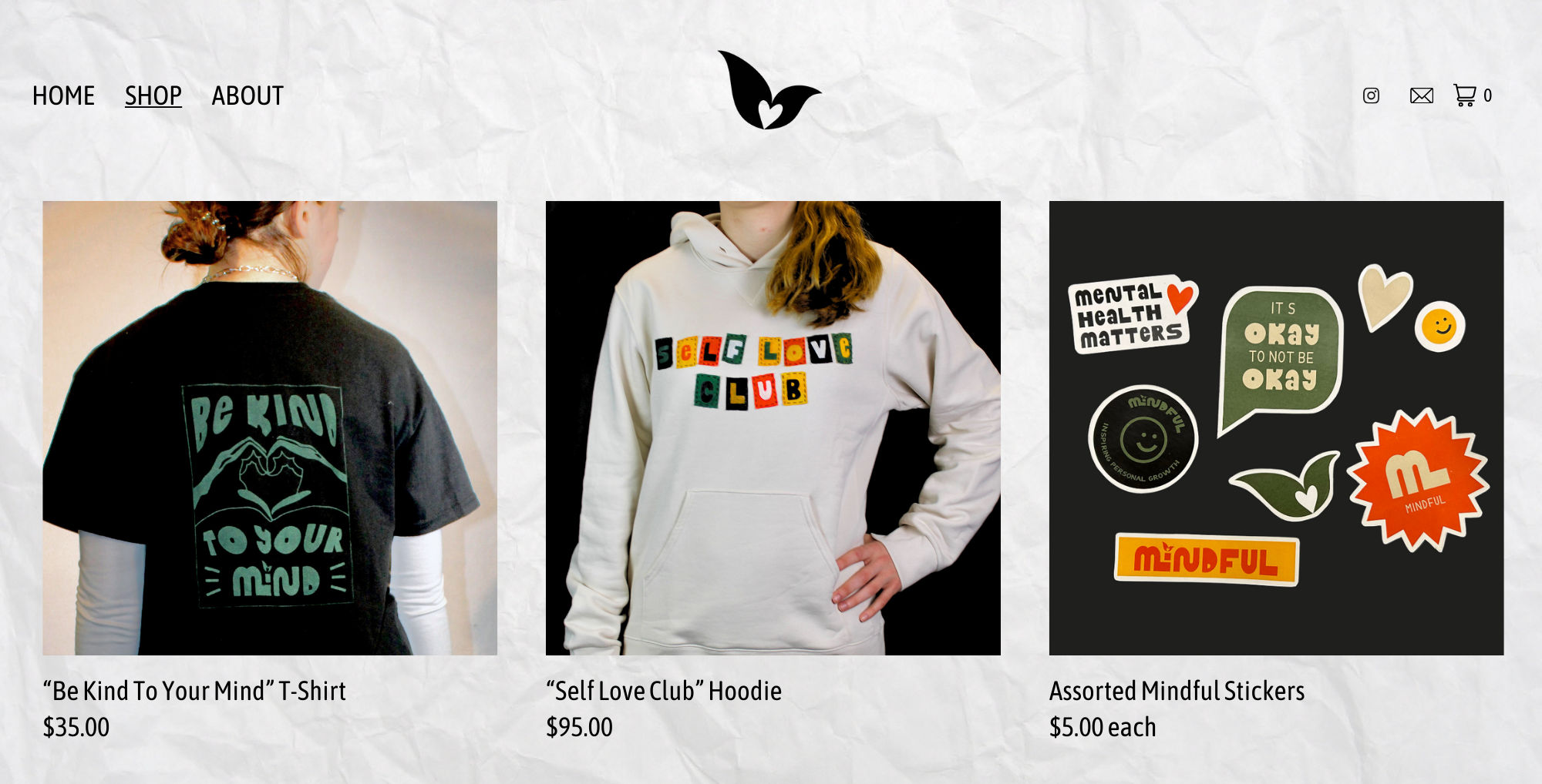 These designs show what a website could look like for the Mindful brand, including the home page, about page, shop page, and a product page. I made sure to incorporate different mixed media elements in the website, such as the layering of stickers and use of paper texture, to keep the website from looking flat.